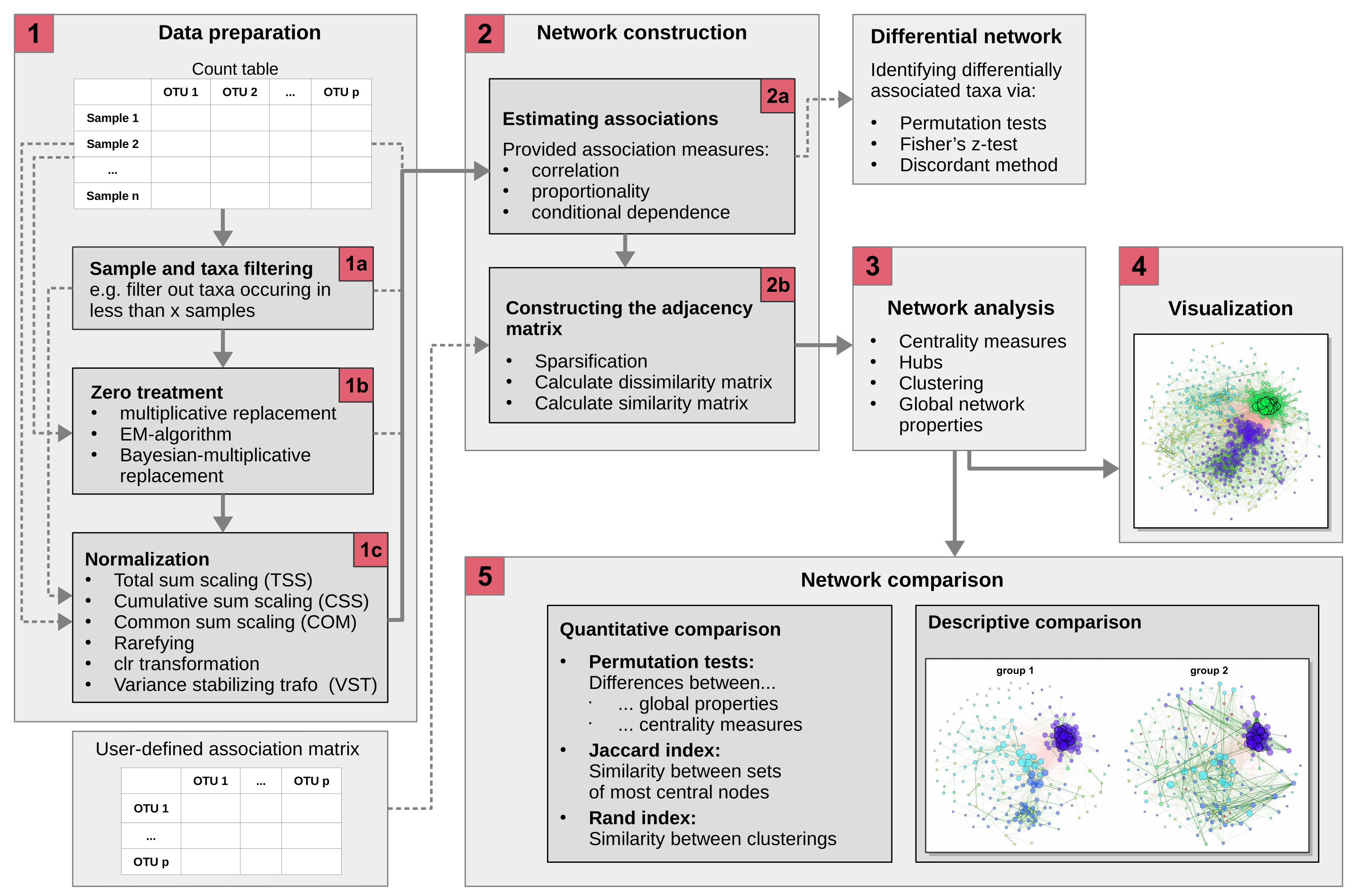 With NetCoMi, users can construct microbial association or dissimilarity networks directly from sequencing data, typically provided as a read count matrix. The package includes a broad selection of methods for handling zeros, normalizing data, computing associations between microbial taxa, and sparsifying the resulting matrices. By offering these components in a modular format, NetCoMi allows users to tailor the workflow to their specific research needs, creating highly customizable microbial networks.